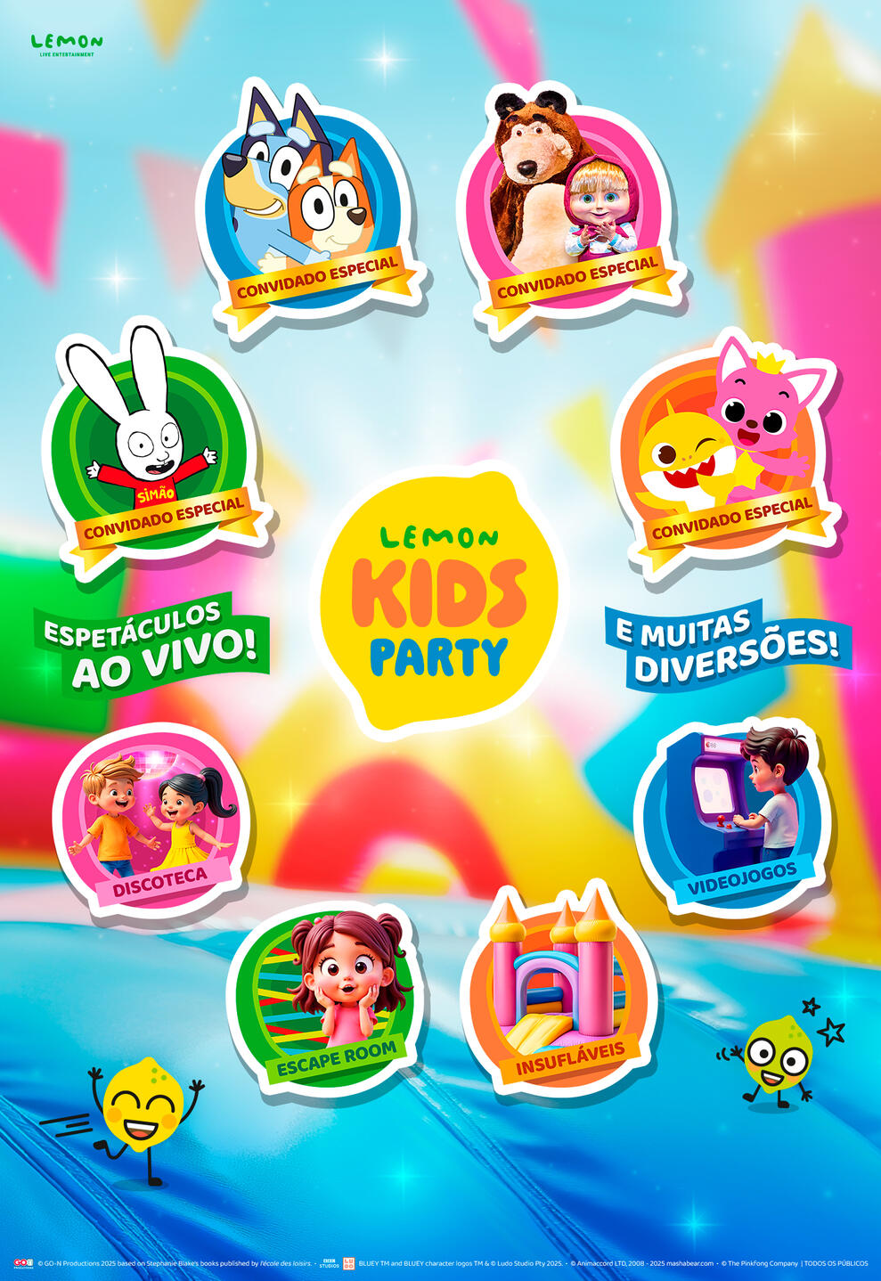 O evento indoor que promete uma festa cheia de diversão, para toda a família!Neste evento repleto de alegria vão estar espalhados pelo recinto várias animações, insufláveis, matraquilhos humanos, uma piscina de bolas e ainda trampolins, pista de karts a pedal e muito mais!O Lemon Kids Party tem ainda um espaço de jogos Arcade, a melhor Discoteca de sempre, com músicas e coreografias, e ainda um Escape Room.Para além destas activações os mais pequenos vão ainda poder vibrar com as actuações musicais da Bluey, Masha e o Urso, Baby Shark e Coelho Simão, as suas personagens das séries animadas preferidas!O Lemon Kids Party é uma produção da Lemon Live Entertainment, especialmente preparada para famílias e crianças de todas as idades (com entrada gratuita para crianças entre os 0 e os 24 meses), disponibilizando duas sessões separadas, uma para a manhã, com início às 10h00, e outra à tarde, com início às 15h00, bem como áreas de alimentação e espaços sentados.